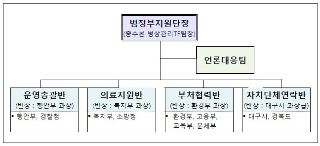 ‘범정부지원단’은 중앙사고수습본부 병상관리TF팀장을 단장으로 하고, 그 아래 행정안전부, 보건복지부, 환경부, 자치단체 등 10개 기관 합동 5개 반·팀(과장급)으로 구성된다.