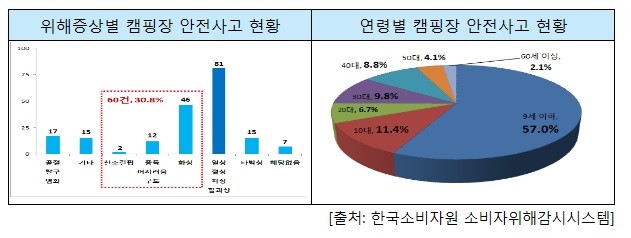 최근 5년 간 접수된 캠핑장 안전사고를 위해 원인별로 분석한 결과, `미끄러짐·넘어짐', `부딪힘' 등 물리적 충격으로 발생한 사고가 93건(47.7%)으로 가장 많았고, 화재·연기·과열·가스 관련 사고가 50건(25.6%)으로 뒤를 이었다.