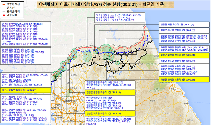 국립환경과학원은 2월 21일 폐사체 7개체에서 아프리카돼지열병 바이러스를 확진하고 결과를 관계기관에 통보했다. 이로써 파주시 65건, 연천군 73건, 화천군 84건의 멧돼지 아프리카돼지열병이 확진됐으며, 전체 244건이 됐다.