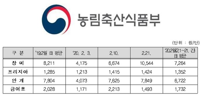 농식품부, 소속.산하기관, 농협 등 유관기관 21개 기관은 71만 송이를 구매하고 화훼 소비확대 분위기 조성을 위해 노력하고 있다.