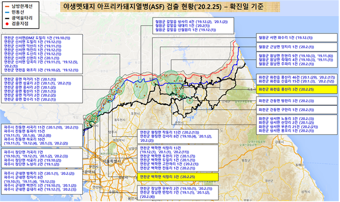 국립환경과학원은 2월 25일 폐사체 6개체에서 아프리카돼지열병 바이러스를 확진하고 결과를 관계기관에 통보했다. 이로써 연천군 80건, 화천군 95건, 철원군 22건, 파주시 66건, 전체 263건의 멧돼지 아프리카돼지열병이 확진됐다.