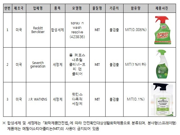 한편, 환경부는 해외직구 스프레이형 세정제 및 합성세제 중 국내에서 함유가 금지된 메틸이소티아졸리논(MIT)이 쓰인 3개 제품에 대하여, 해당 제품을 해외직구로 판매하는 온라인 쇼핑몰에 판매중지 조치했다.