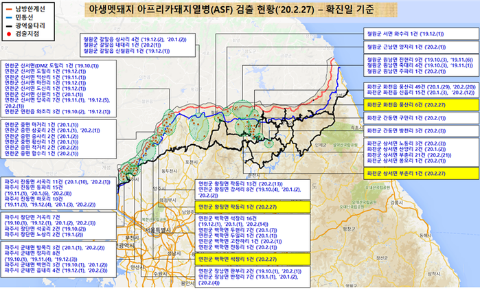 국립환경과학원은 2월 27일 폐사체 9개체에서 아프리카돼지열병 바이러스를 확진하고 결과를 관계기관에 통보했다. 이로써 화천군 102건, 연천군 82건, 파주시 66건, 철원군 22건, 총 272건의 멧돼지 아프리카돼지열병이 확진됐다.