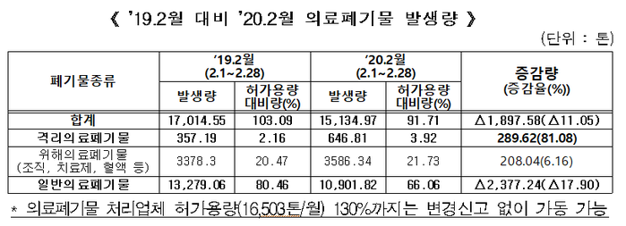 한편, 환경부는 코로나-19 확산에도 불구하고 2020년 2월 의료폐기물 발생량은 전년 동월 대비 1,898톤 감소하였으며, 아직까지 의료폐기물 처리용량에 여유가 있다고 밝혔다.
