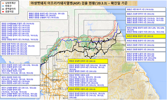 국립환경과학원은 3월 3일 폐사체 8개체에서 아프리카돼지열병 바이러스를 확진하고 결과를 관계기관에 통보했다. 이로써 화천군 120건, 연천군 96건, 파주시 68건, 철원군 22건, 총 306건의 멧돼지 아프리카돼지열병이 확진됐다.