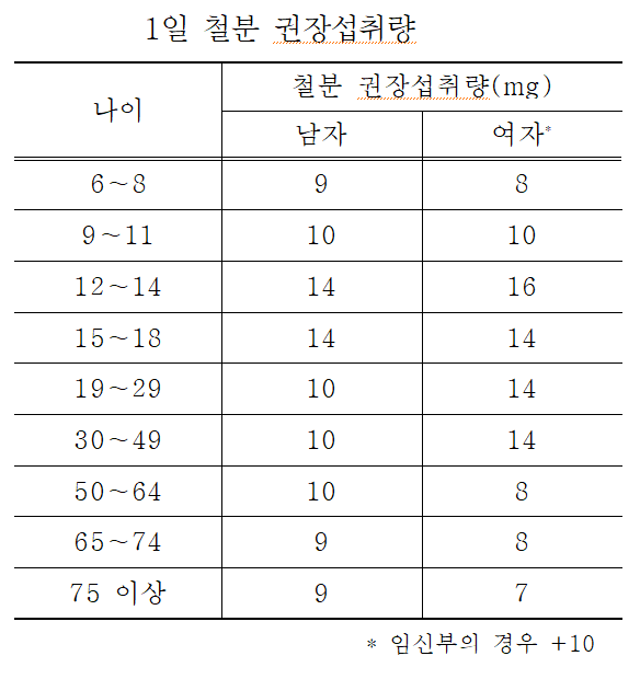 철분은 혈액 내 헤모글로빈을 구성하는 필수 영양 성분이지만 연령대 별로 권장 섭취량에 차이가 있으며, 우리나라는 성장기 청소년과 여성, 임산부가 철분 섭취가 부족한 것으로 알려져 있다.