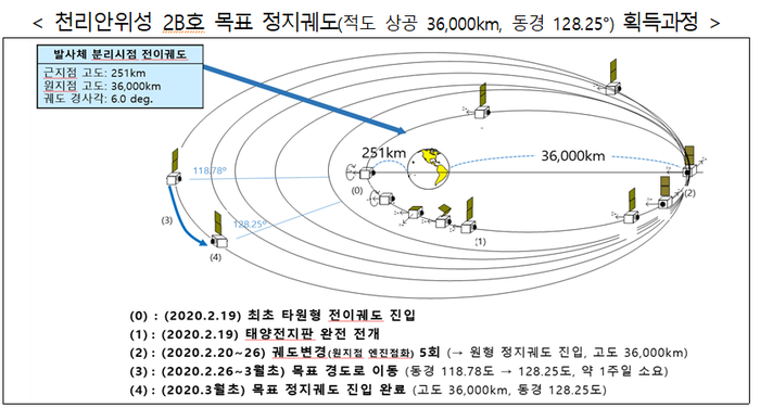 지난 2월 19일 발사에 성공한 천리안위성 2B호는 다음날 20일(목)부터 26일(수)까지 7일간 총 5회의 궤도변경 과정을 거쳐 최초 타원형 전이궤도에서 고도 35,786km, 동경 118.78도의 원형 정지궤도에 정상 진입하였다.