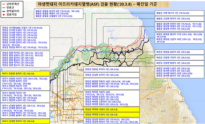 국립환경과학원은 3월 8일 폐사체 5개체에서 아프리카돼지열병 바이러스를 확진하고 결과를 관계기관에 통보했다. 이로써 화천군 130건, 연천군 103건, 파주시 70건, 철원군 22건, 총 325건의 멧돼지 아프리카돼지열병이 확진됐다.