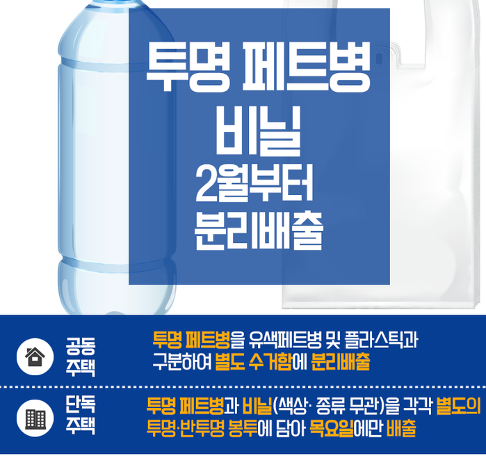 분리배출 기준에 따르면 폐비닐은 비닐의 색상이나 재활용마크에 관계없이 물로 깨끗이 씻어 투명비닐 봉투에 담아 지정된 요일(기존 월·수·금 수거지역은 금요일, 그 외 지역은 목요일)에만 별도 배출해야 하고, 오염이 심하고 이물질 제거가 어려운 폐비닐은 종량제봉투에 배출해야 한다. 무색 투명 폐페트병은 라벨(비닐) 제거 후 지정된 요일(폐비닐 수거일과 동일)에 별도 배출한다.