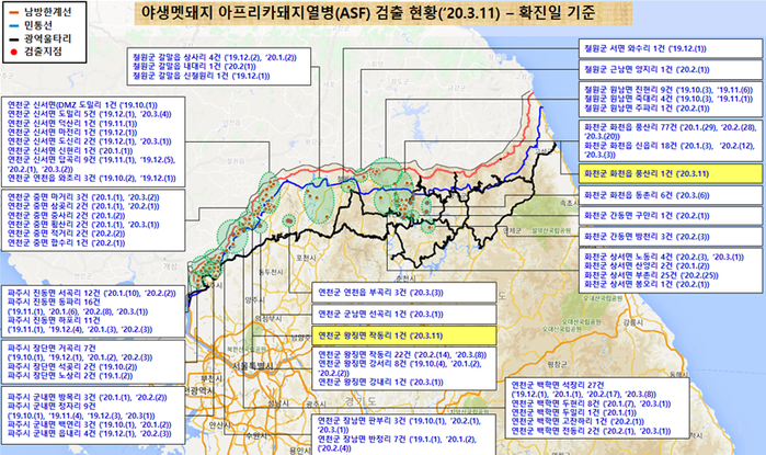 국립환경과학원은 3월 11일 폐사체 2개체에서 아프리카돼지열병 바이러스를 확진하고 결과를 관계기관에 통보했다. 이로써 화천군 138건, 연천군 119건, 파주시 70건, 철원군 22건, 총 349건의 멧돼지 아프리카돼지열병이 확진됐다.