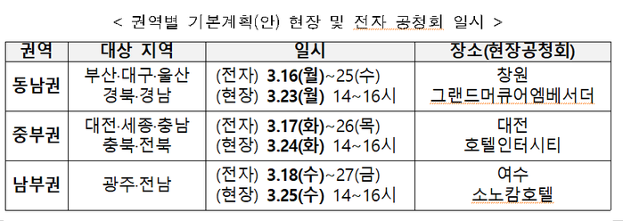다만, 코로나19 상황에서 의견을 수렴해야 하는 점을 감안하여, 3월 16일부터 27일까지 전자공청회를 현장공청회 개최 전후에 걸쳐 권역별로 10일간 진행한다. 또한, 현장공청회도 환경부 페이스북으로 실시간 중계하여 이해관계자의 충분한 참여가 이루어질 수 있도록 할 예정이다.