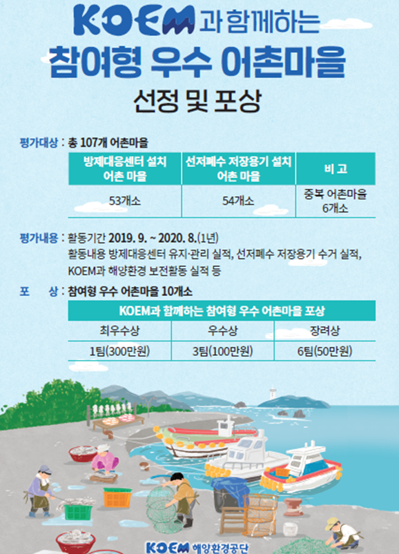 해양환경공단( 이사장 박승기)은 어촌마을의 해양오염 방제에 대한 관심과 해양환경 보전 활동을 고취시키기 위해 ‘KOEM과 함께하는 참여형 우수 어촌마을’을 선정하여 포상할 계획이라고 밝혔다.