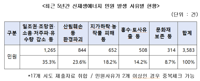 최근 5년간 신재생 민원 2,118건 달해… 산업부는 민원 현황 파악하지 않은 채 지자체에 떠넘겨