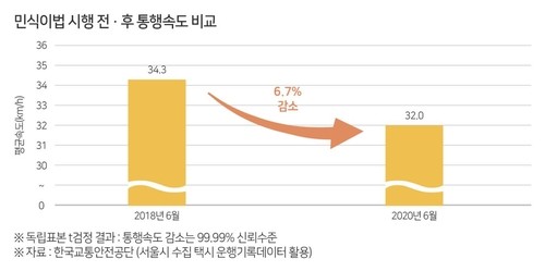 21일 한국교통안전공단에 따르면 민식이법 시행 전(2018년 6월)과 시행 후(2020년 6월) 서울시 스쿨존 주변의 통행속도를 분석한 결과, 어린이 통학 시간대(오전 6∼9시·낮 12시∼오후 3시)의 택시 평균 통행속도는 2018년 6월 시속 34.3㎞에서 올해 6월 시속 32.0㎞로 6.7% 감소한 것으로 나타났다.