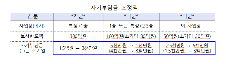 사업장의 배상금 부담도 완화된다. 예를 들어 30억 원 보상한도의 환경책임보험을 가입한 사업장의 경우, 자기부담금이 1,500만 원(보상한도의 0.5%)에서 300만 원(보상한도의 0.1%)으로 줄어든다.
