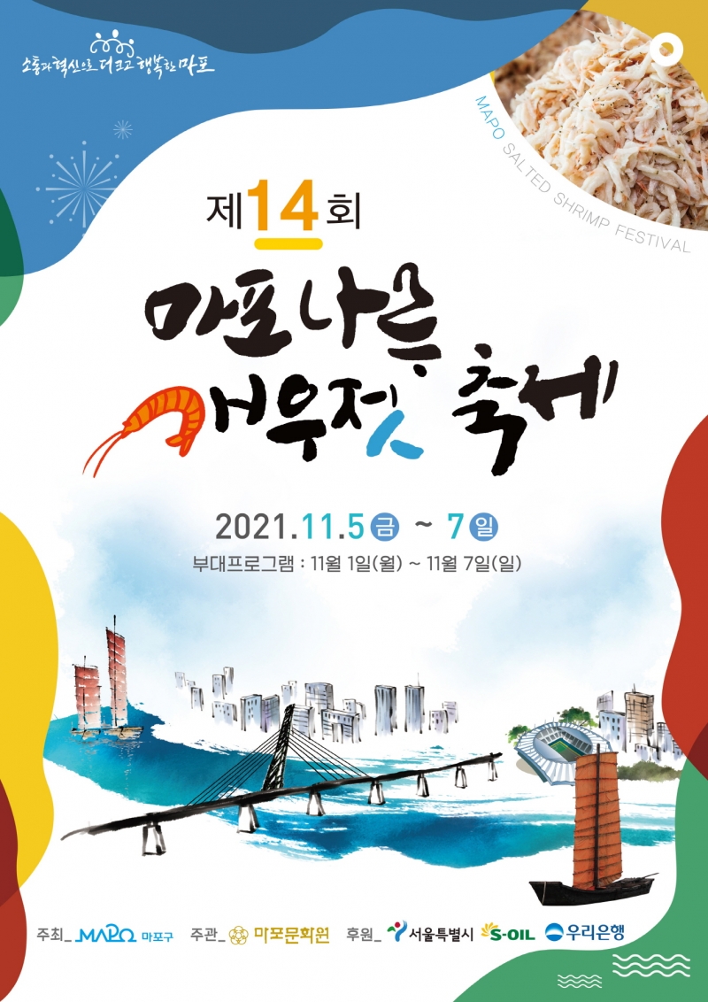 서울 도심 한복판에서 마포나루의 번성했던 옛 모습을 재현하고, 마포나루에 실어 나르던 유명산지 새우젓을 할인된 가격에 살 수 있는 ‘제14회 마포나루 새우젓축제’가 11월 5일부터 7일까지 3일간, 온·오프라인으로 열린다.