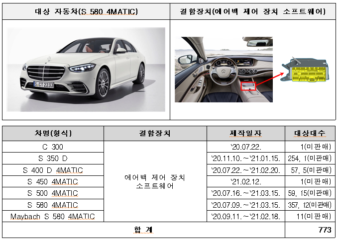 메르세데스벤츠코리아㈜에서 수입, 판매(판매이전 포함)한 S 580 4MATIC 등 7개 차종 773대는 에어백 제어 장치 소프트웨어의 오류로 충돌 시 조수석 에어백이 전개되지 않아 탑승자에게 상해를 입힐 가능성이 확인되었고,