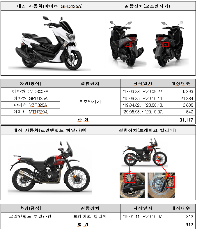 ㈜한국모터트레이딩에서 수입, 판매한 야마하 GPD125A 등 4개 이륜 차종 31,117대는 한국교통안전공단 자동차안전연구원의 자기인증적합조사 결과, 보조반사기의 반사 성능이 안전기준에 부적합한 것으로 확인되어 우선 수입사에서 자발적으로 시정조치(리콜)를 진행하고, 추후 시정률 등을 감안하여 과징금을 부과할 계획이다.