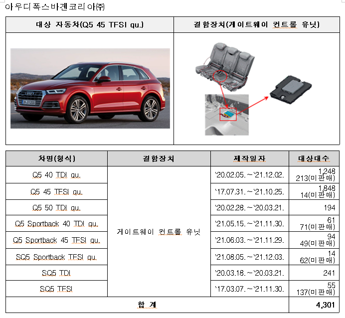 해당 차량은 2월 7일부터 아우디폭스바겐코리아㈜ 공식 서비스센터에서 무상으로 수리(부품 수리)를 받을 수 있다.