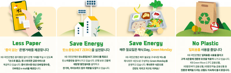 KB국민은행은 ESG 실천의 일환으로 고객과 함께하는 KB Green Wave 캠페인을 진행하며 종이 및 전기사용 줄이기, 일회용품 줄이기 등 다양한 친환경 활동을 실천해왔다.