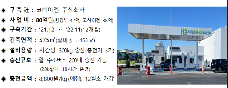 이번 사업을 주관한 코하이젠(주)는 2020년 10월 수소경제위원회(위원장 국무총리) 제2차 회의에서 민관 협약을 맺고 2021년 3월 출범한 상용차(버스 등)용 수소충전소 구축 전문기업(SPC)이다.