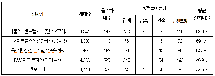 전기자동차 충전소 설치비율 상위 단지를 보면 만리2구역 서울역 센트럴자이 82.0%, 금호15구역 금호파크힐스 이편한세상 69.1%, 흑석6구역 흑석 한강센트레빌2차 54.5% 등이다.