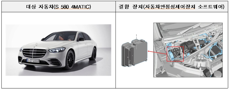 벤츠 는 S 580 4MATIC 등 10개 차종, 9,178대는 자동차안정성제어장치의 소프트웨어 오류로 인한 자동차안정성제어장치의 소프트웨어 오류로 초기 차량 진단 시 펌프 모터 전원공급장치를 고장으로 인식하여 자동차안정성제어장치가 작동되지 않을 가능성이 있어 6월 23일부터 시정조치에 들어간다.