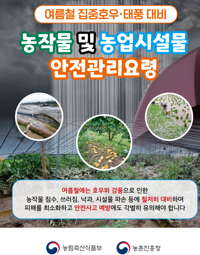 농촌진흥청 농촌지원국 권철희 국장은 “집중호우로 인한 장마철 농작물과 농업시설물 등의 피해 줄일 수 있도록 선제적 기술지원을 펼치고 있다.”라며 “농업인들께서는 기상정보를 참고하여 작물별 예방조치를 해주실 것을 당부한다.”라고 말했다.