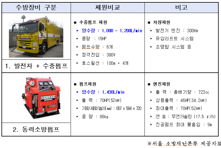 소방재난본부는 현재 보유하고 있는 발전차 2대와 수중펌프 913대 이외 추가로 발전차 2대(10억 원)와 수중펌프 12대를 12월까지 제작을 완료, 강남소방서 등에 배치할 예정(기존 발전차 2대 강남소방서1, 도봉소방서1 배치중)이다.