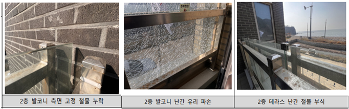 타일줄눈 시공불량과 코킹 누락은 기본이고, 2층 사무실 천정 부분 미시공, 외부 계단 난간 부식, 계단 미장면 균열, 청사 울타리 지지대 균열, 관측 장소 울타리 흔들림, 페인트 부실 등 일일이 열거가 불가능할 정도로 총체적 부실시공을 확인할 수 있었다.