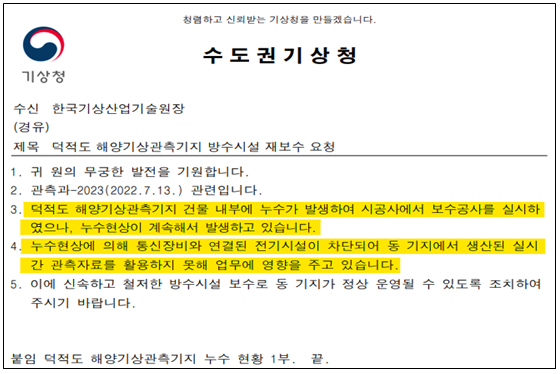 시공업체는 인천지역 업체 주식회사 유성산업이다. 유성산업은 지난 1년간 시설관리 위탁자인 한국기상산업기술원의 수차례 하자보수 요구에 미진하게 대응했다.