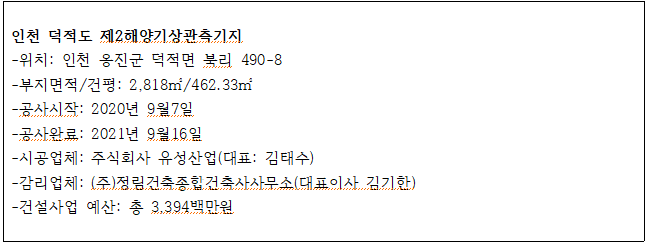 한국기상산업기술원이 올해 4월 법무법인을 통해 진행한 덕적도 해양기상관측기지 건물에 발생한 하자 및 부실 사항 조사 결과 총 108개의 하자‧부실이 확인됐다.