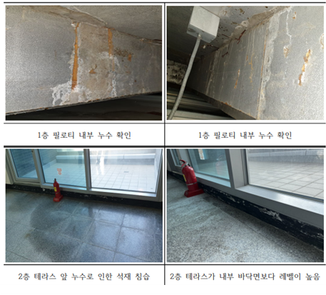 우선 1층 사무실 창문 상단부 다수, 1층 필로티 천정, 2층 테라스 앞 복도바닥, 2층 사무실 창호 상단부 다수, 2층 옥상 계단 벽체부 등에서 누수가 발견됐다.