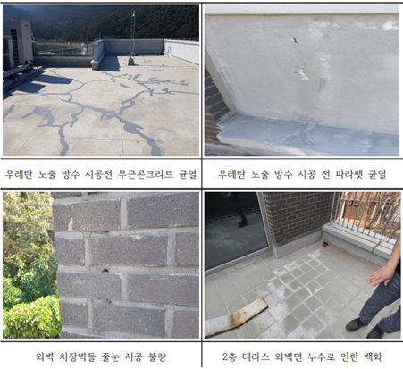 1‧2층 각 부위 누수가 가장 심각했지만, 옥상, 계단, 화장실, 외부 시설에 이르기까지 정상 시공된 부분이 있는지 의문이 들 정도로 총체적 문제가 있었다.