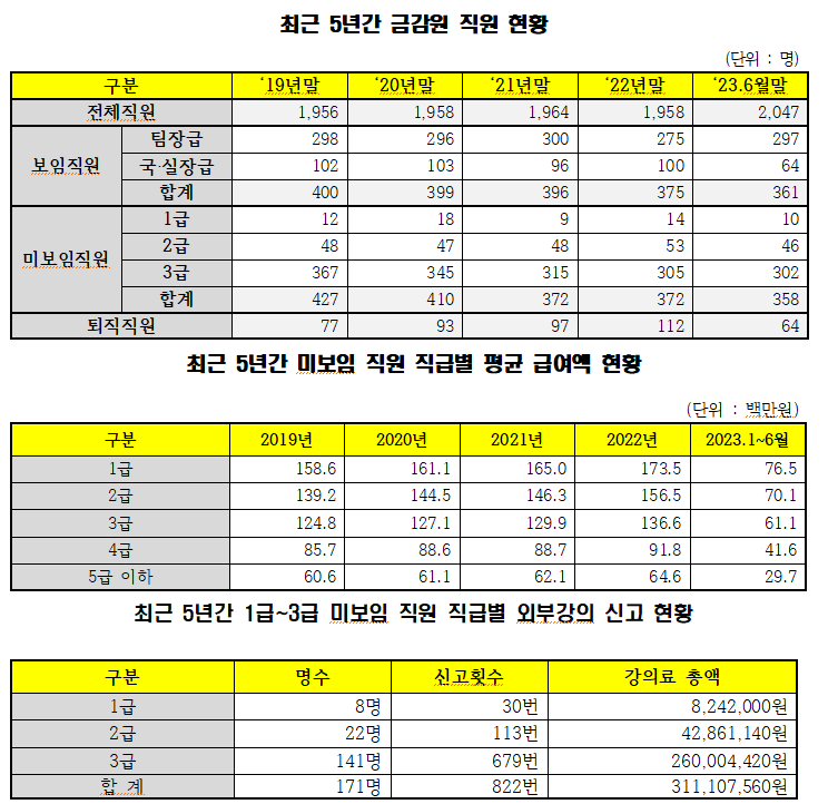 미보임 상위직급의 평균 연봉은 ▲1급 1억 6천 ▲2급 1억 4천 ▲3급 1억 3천에 달한다. 한 편 1급~3급 미보임직원의 최근 5년간(2019년~2023.06) 외부강의 신고 현황을 확인해본 결과 171명이 총 822번의 외부강의를 진행한 것으로 밝혀졌다. 강의료 신고 총 금액은 3억 1천만원으로 이는 급여 외 소득에 해당한다.