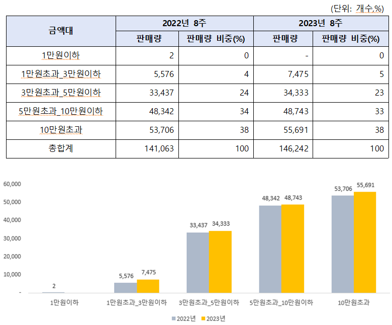 올해 추석 선물 세트 판매량은 전년 대비 3.7% 증가했다. 가격대별 판매량은 △10만 원 초과(38%) △5만 원 초과 10만 원 이하(33%) △3만 원 초과 5만 원 이하(23%) 순으로 높게 나타났다. 축평원 관계자는“최근 한우 도축 수가 증가하고, 대형마트에서 가격 부담을 낮춘 실속형 추석선물 세트를 선보이면서 판매량이 증가한 것으로 보인다.”라고 말했다.