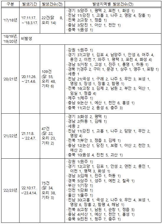 가축별 고병원성조류인플루엔자(AI) 발생 건수는 오리가 123건으로 가장 많았고, 닭 119건, 메추라기, 앵무새 등 기타 11건 등으로 나타났으며, 지역별로는 전라남도 73건, 경기도 57건, 전라북도 33건, 충청북도 31건, 충청남도 28건, 경상북도 12건, 경상남도 10건 등의 순으로 조사됐다.