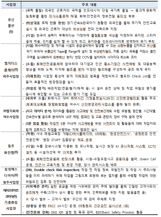 이들 기업은 △유독물 저장소 충전 시설의 실내 설치, △사고 데이터 분석을 통한 안전관리, △현장 스태프 집중양성 제도, △그림을 통한 작업 전 위험 예측, △사외배관 관리 공조체계 구축 등의 우수사례를 제시했다.