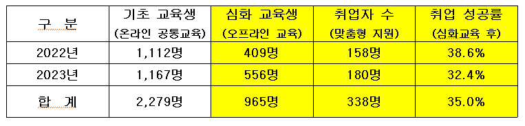 올 들어 3회차를 맞은 이번 사업은 2022년 중장년층의 강소기업 재취업을 목표로 첫 사업을 시작했다. 2023년에는 중장년층 디지털 분야 재취업을 위한 일자리 시장 개척과 취업 연계를 지원해 지난 2년간 2,279명(기초 교육 수료)이 프로그램을 경험했으며, 신중년 맞춤형 취업 지원을 받은 965명 중 338명이 취업에 성공하는 등 괄목할 만한 성과를 거둔 바 있다.
