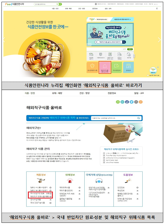 참고로 식약처는 소비자가 위해 성분·원료를 일일이 식별하기 어렵다는 점을 감안하여 위해한 해외식품으로 인한 국민의 피해를 예방하기 위해 ‘해외직구 위해식품’ 목록을 공개(3,427개, ’24.4.14. 현재 기준)하고 있다. 소비자는 해외직구식품을 구매하기 전 식품안전나라 누리집 ‘해외직구식품 올바로*’에서 위해식품인지를 먼저 확인하는 것이 중요하다.