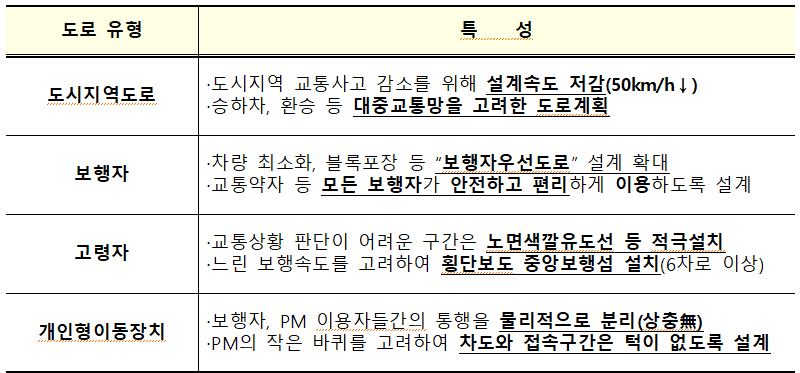 국토부에서는 보행자, 고령운전자, 개인형 이동장치(PM)의 안전환경을 고려하여 도로를 설계할 수 있도록 ’21년 3월 ‘사람중심도로 설계지침’을 제정 한 바 있다.