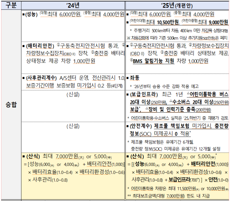 전기승합차도 전기승용차와 같은 정책방향으로 보조금 체계를 개편한다. 먼저 1회충전 주행거리가 대형 기준 500km 미만일 경우 보조금이 차감되도록 하여 주행거리에 따른 성능기준을 강화( (대형) 차등시점 500km로 상향, 10km당 차등폭 400~500km 50만원, 400km 미만 84만원(중형) 차등시점 400km로 상향, 10km당 차등폭 300~400km 30만원, 300km 미만 66만원)하고, 배터리안전보조금(1,000만원) 지급 항목에 배터리 관리 시스템(BMS)을 활용한 주차중 이상감지 및 알림기능 지원을 추가한다.