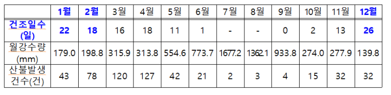 아울러, 건조특보 발효 평균 일수도 1990년대( 건조주의보는 1997년부터 월별 데이터로 관리하여 1997년부터 평균을 냄 ) 36일에서 2000년대 48일, 2010년대 64일, 2020년대 66일로 꾸준히 증가추세를 보이는 것으로 확인됐다. 산림청에 따르면, 최근 5년간(2020~2024년) 겨울철 건조특보는 전국적으로 평균 66일간 발효되었으며, 산림의 상대습도가 낮거나 건조 일수가 많으면 산불발생 건수가 증가한다고 밝혔다.