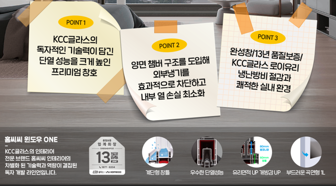 특히 홈씨씨 윈도우 ONE은 KCC글라스가 가공부터 설치까지 전 과정을 직접 관리하는 ‘완성창’ 제품으로 항목에 따라 업계 최장 수준인 최대 13년의 품질 보증을 제공한다. 또한 창호 면적의 약 80%를 차지하는 유리에는 국내 대표 종합 유리 기업인 KCC글라스의 고단열 특수 코팅 ‘로이(Low-E)유리’를 적용할 수 있어 냉난방 에너지 절감 효과가 우수하다.
