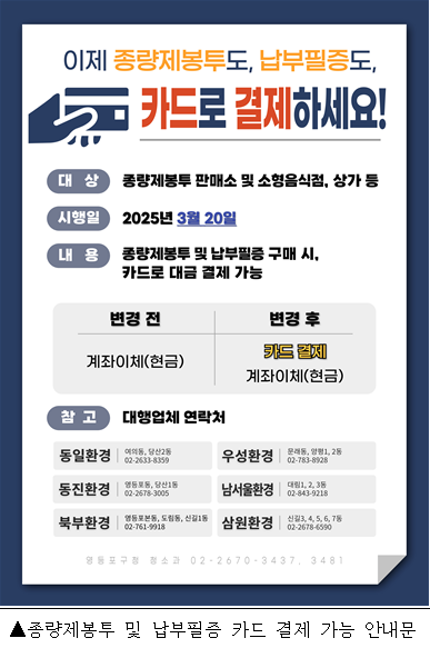 최호권 영등포구청장은 “이번 카드 결제 도입으로 소형 음식점과 봉투 판매소의 운영 부담을 줄이는 데 도움이 되기 바란다”라며 “앞으로도 소상공인과 구민을 위한 실효성 있는 지원을 지속적으로 마련해 나가겠다”라고 전했다.