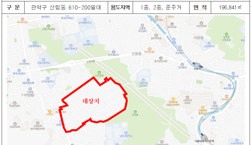 관악구 신림동 119-1일대는 일명 고시촌 지역으로 반지하주택 비율이 높고 접도율이 낮은 열악한 노후 불량주택이며, 금번 후보지 선정으로 주거환경개선 및 양질의 주택공급이 될 것으로 기대된다.