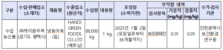 회수 대상은 수입식품등 수입·판매업체 ‘(주)케이원무역(경기도 평택시)’이 수입한 베트남산 아욱(포장일자: 2025. 1. 2)’ 제품이다.