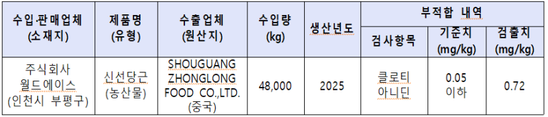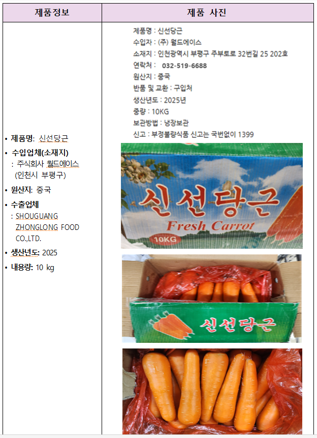 식품의약품안전처(처장 오유경)는 수입식품등 수입·판매업체인 ‘주식회사 월드에이스(인천시 부평구 소재)’가 수입해 판매한 중국산 ‘당근’에서 잔류농약(클로티아니딘: 당근, 배추 등 농산물에 사용되는 살충제 )이 기준치(0.05 mg/kg 이하) 보다 초과 검출되어 해당 제품을 판매 중단하고 회수 조치한다고최근공시를 통해 밝혔다.