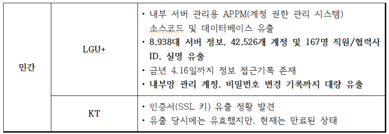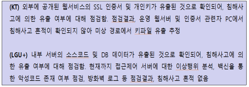 또한, LGU+ 에 대해서도 “유출된 데이터는 내부 시스템에서만 존재해야하고 외부에 유출되어져서는 안되는 파일로 이 파일에는 접속계정 및 암호화된 비밀번호 등이 담겨있으며 즉, 파일 데이터 내용이 공개됐다는 것은 미상의 경로로 유출된 것으로 이는 명백히 침해사고의 판단근거가 된다”는 ‘잠정결론’을 내렸다.