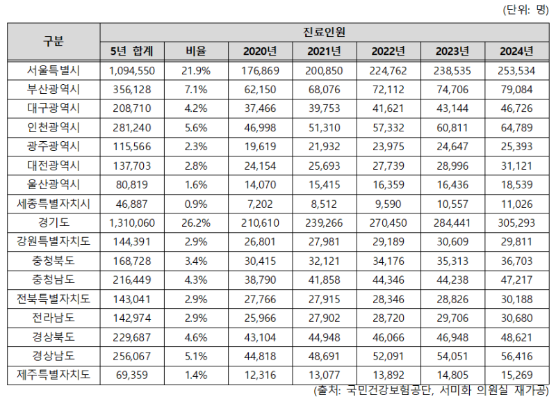 연령별로는 10대 미만 아동 환자 증가세가 두드러졌다. 10대 미만은 2020년 991명에서 2024년 2,162명으로 5년 새 무려 118.2% 폭증했다. 같은 기간 ▲10대는 83.5%, ▲30대는 69.7%, ▲40대는 52.4% 증가율을 기록했으며, 젊은 세대와 아동·청소년층에서의 증가세가 뚜렷했다.